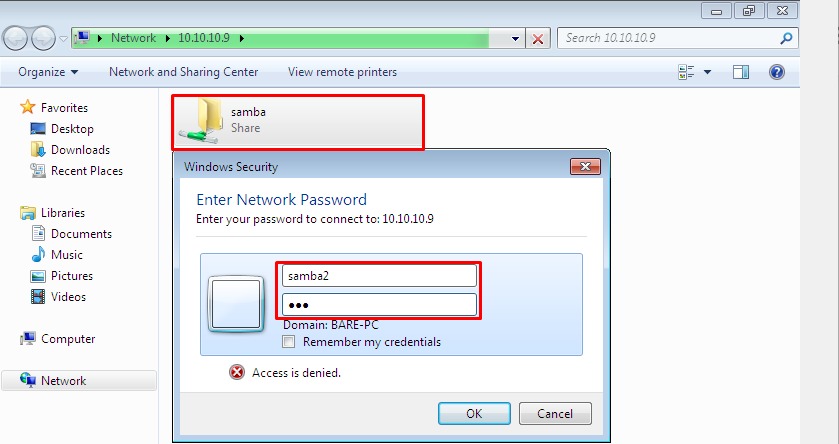 Bagian kotak atas isi sesuai dengan nama samba yang tadi kita buat, paswordnya sesuai debian server.